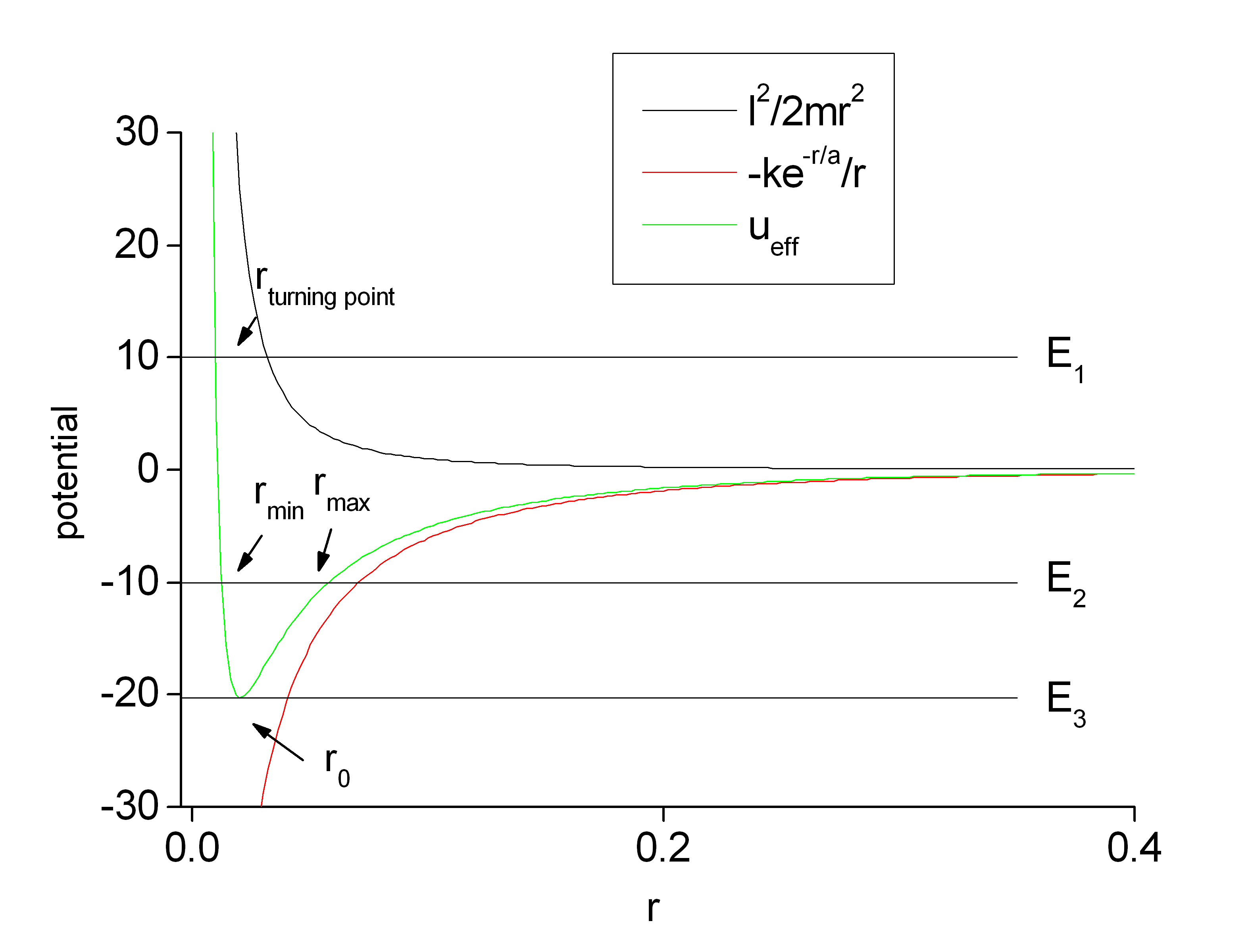 - Plot U(r), l2/(2mr2), and Ueff(r) as a function of r.