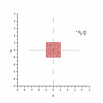 An uniform charge distribution r is as shown above. It occupies a squre region [-1,1]x[-1,1] in the plane. The electrostatic potential at an observation point (xp, yp) due to this charge distribution is obtained by the following integral: